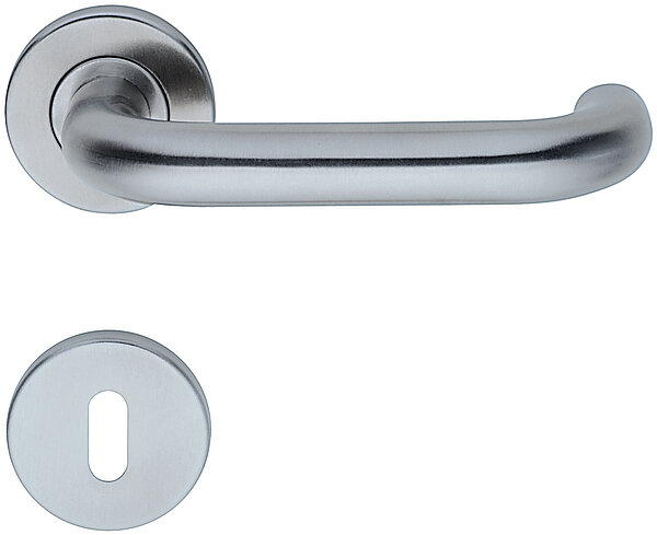 Ausführung: Griff und Rosetten: Edelstahl. Unterkonstruktion: Stahl vernickelt.