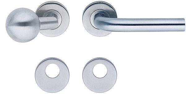 Ausführung: Griff, Knopf, Rosetten: Edelstahl. Unterkonstruktion: Stahl vernickelt.
