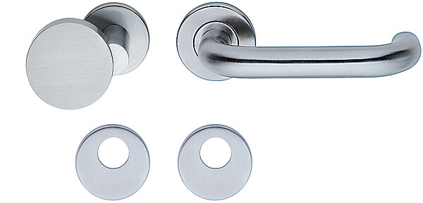 Ausführung: Griff, Knopf, Rosetten: Edelstahl. Unterkonstruktion: Stahl vernickelt.