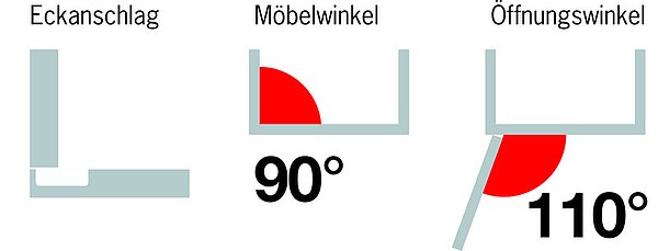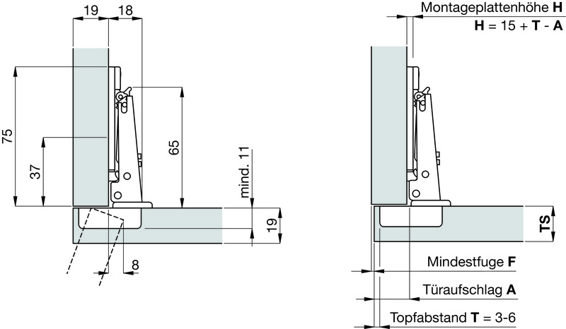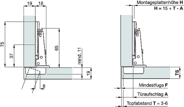 Türaufschlag A: Bis 19 mm bei Standard-Topfbohrung (4 mm) möglich.