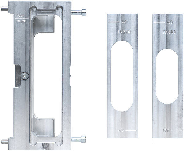 Einzelteile: Die Fräslehre WKZ-IN303-FRA-ALU besteht aus einem Aluminium-Grundkörper sowie je 1 Einlegeschablone für das Rahmen- bzw. das Flügelteil.