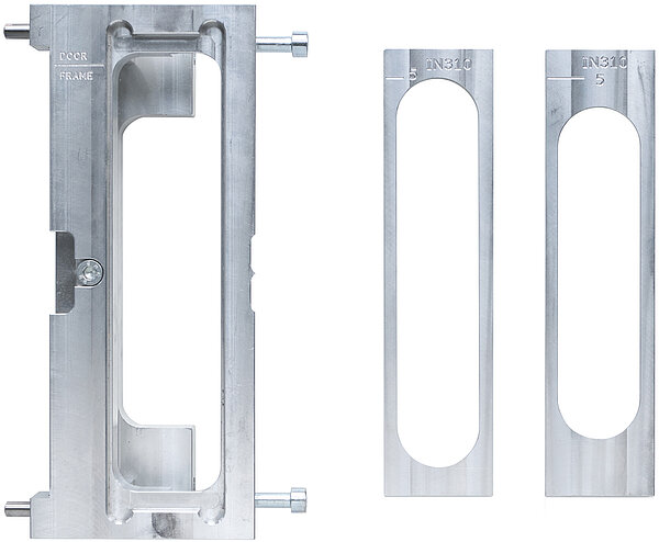 Einzelteile: Die Fräslehre WKZ-IN311-FRA-ALU besteht aus einem Aluminium-Grundkörper sowie je 1 Einlegeschablone für das Rahmen- bzw. das Flügelteil.