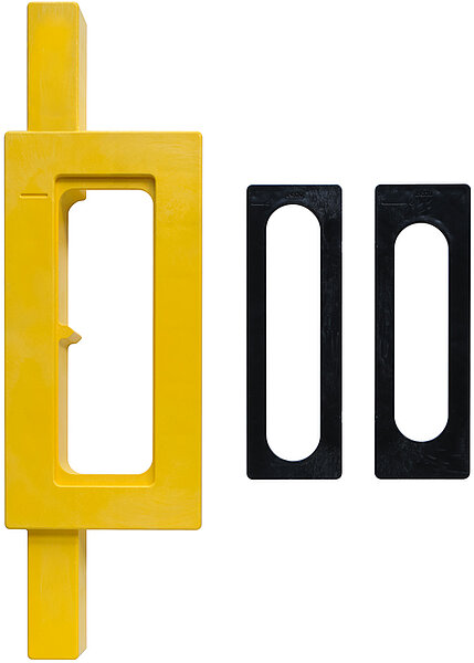 Einzelteile: Die Fräslehre WKZ-IN311-FRA-KU besteht aus einem Kunststoff-Grundkörper sowie je 1 Einlegeschablone für das Rahmen- bzw. das Flügelteil.