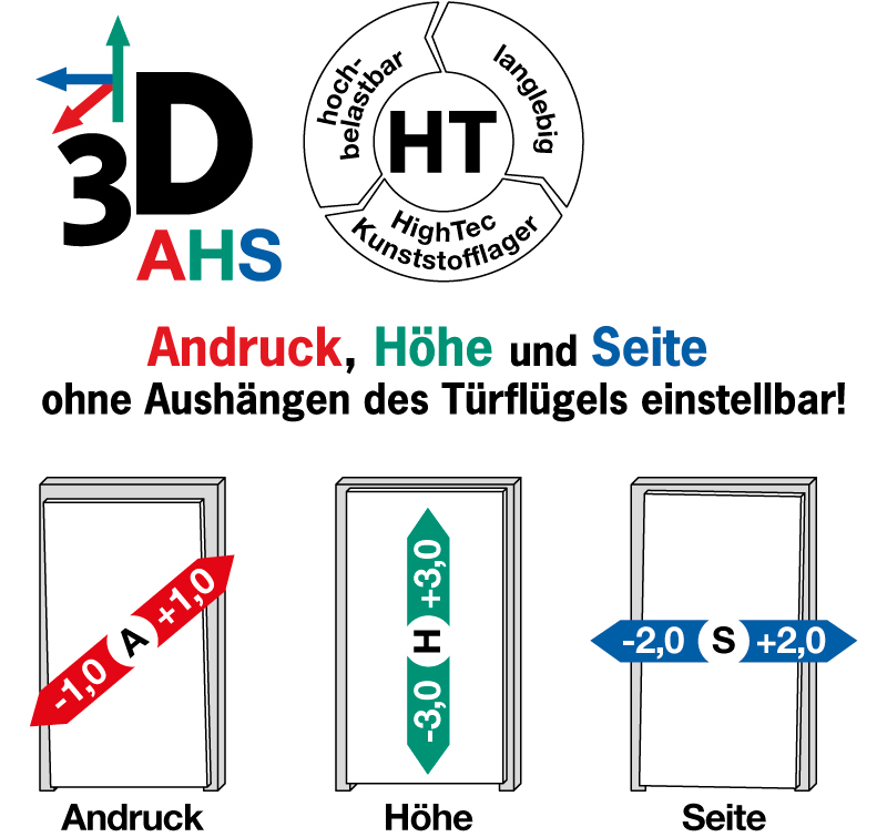 Einsatzbereich: 3-dimensional einstellbares, verdeckt liegendes Taschenband für Haustüren und Objekttüren.