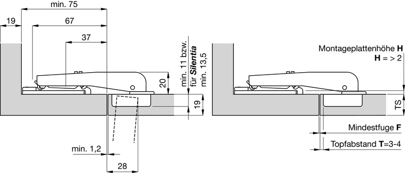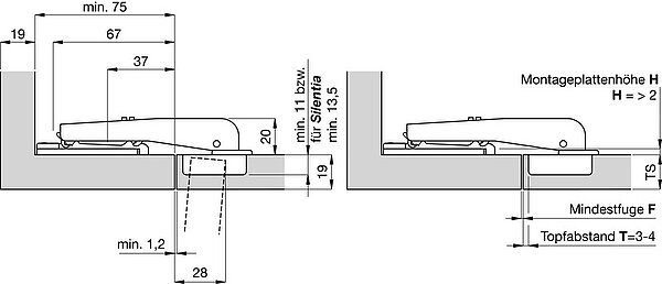 Topftiefe: min. 11 mm bzw. min. 13,5 mm für Silentia.