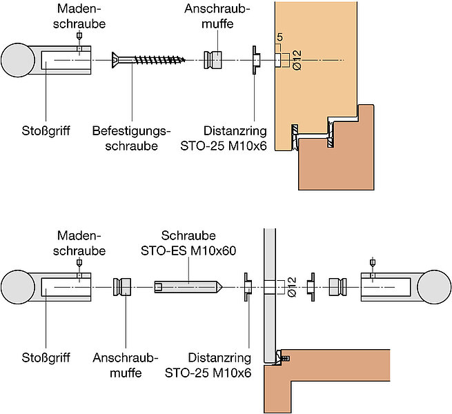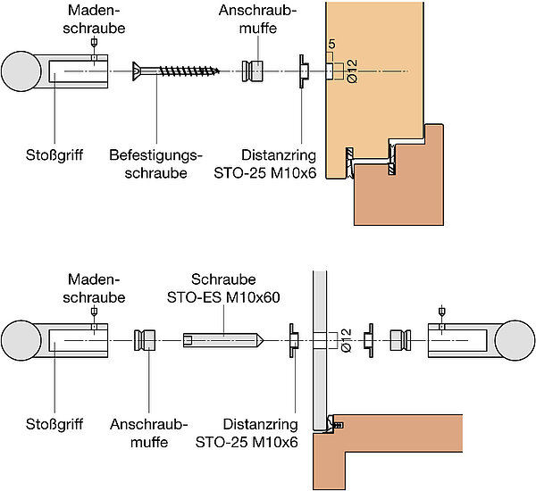 Einsatz: Die Distanzringe DISTANZRINGE-STO-25 M10x6 sind mit einem Flansch ausgestattet und werden serienmäßig bei den passenden Stoßgriffen mitgeliefert. Der Flansch dient sowohl der Zentrierung des Distanzrings mit dem Fuß des Stoßgriffs als auch als notwendiger Schutz beim Einsatz in Glastüren.