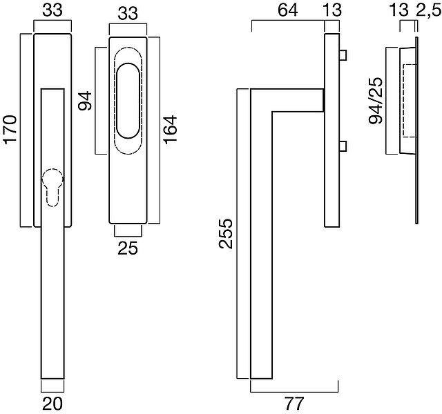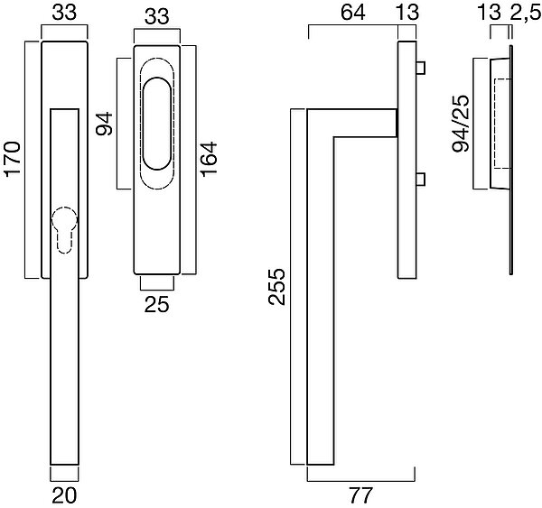 Hebeschiebetürbeschlag - Muschelgriff eckig - 164 mm lang