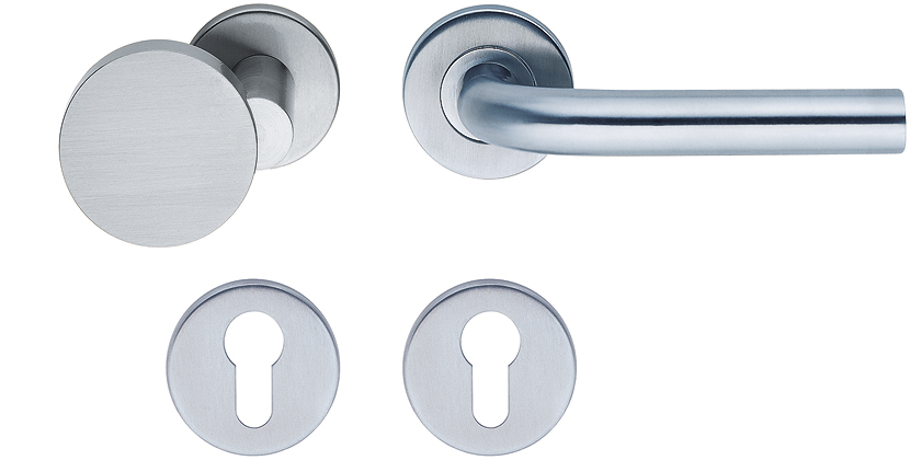 Ausführung: Griff, Knopf, Rosetten: Edelstahl. Unterkonstruktion: Stahl vernickelt.